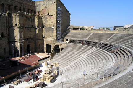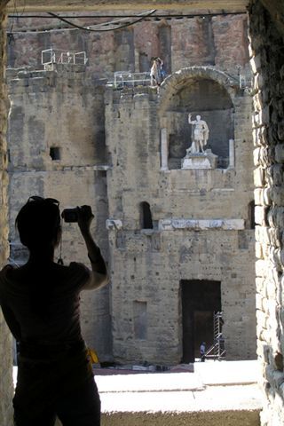 劇場興建於西元前一世紀,是羅馬時代鼎盛時期的建築物,尤其是這面劇場的古牆,